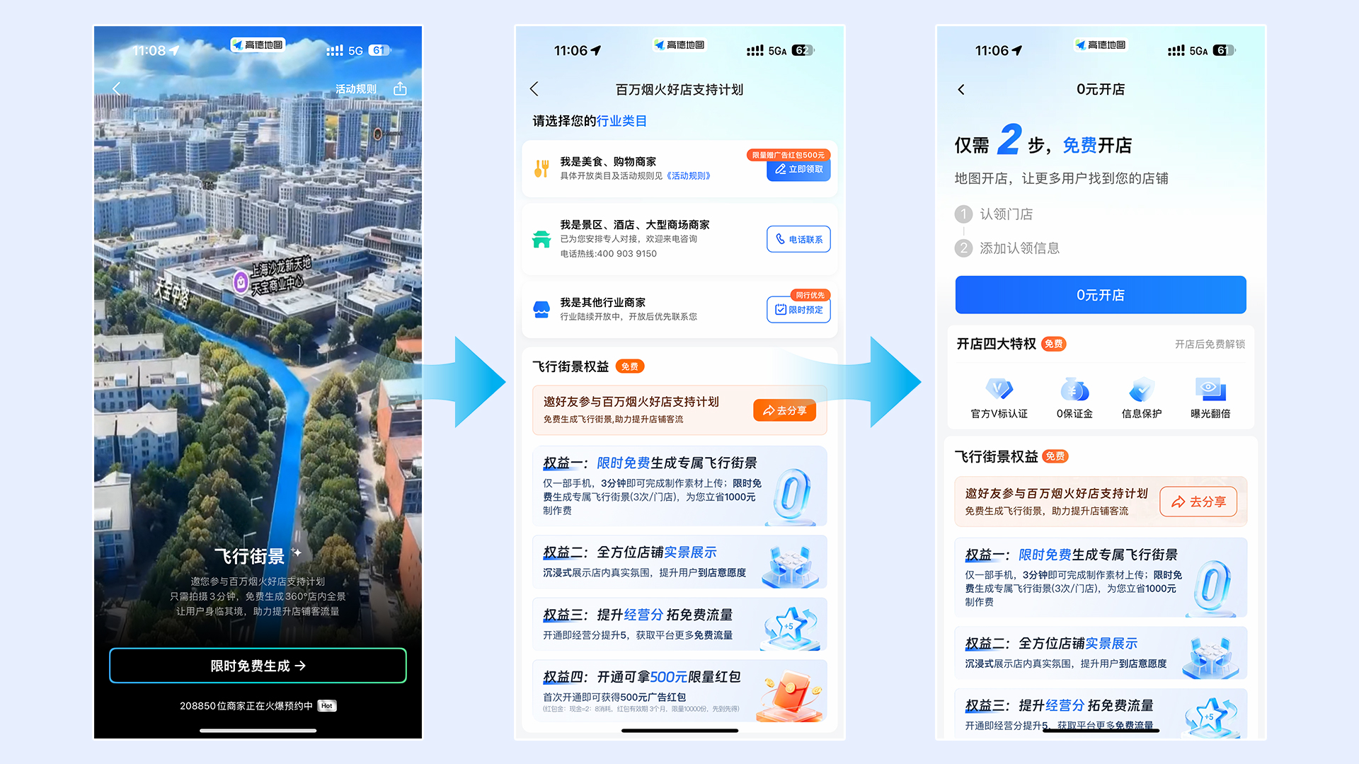 据高德商家成长负责人介绍,飞行街景的操作过程对商家十分友好。商家在高德APP搜索“烟火好店”完成预约后,仅需一部智能手机,根据指引拍摄并上传店内视频和门头照片,即可免费生成专属的“飞行街景”。